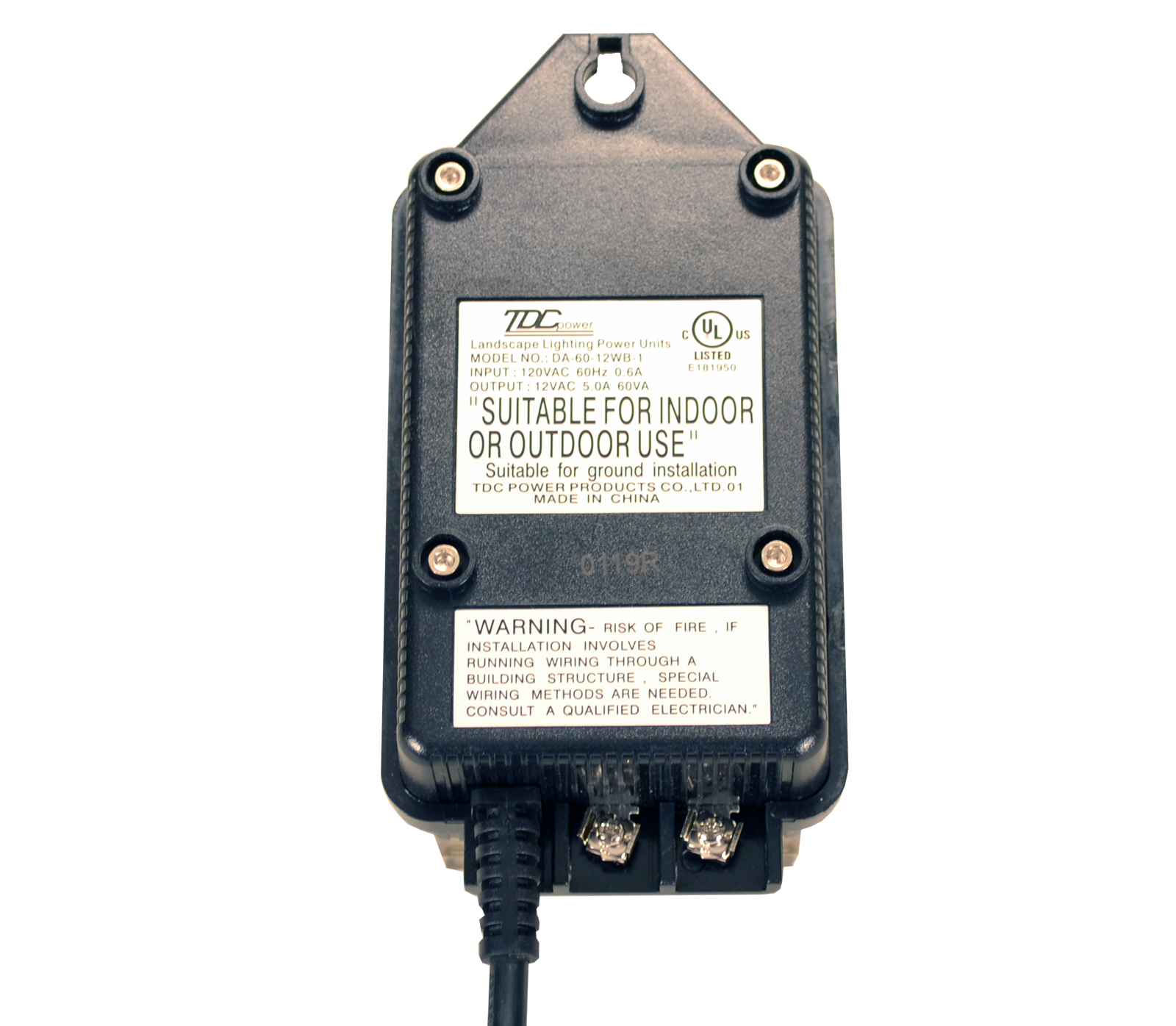 Output: 12 VAC, 60 Hz., 5 Amps (60 Watt power rating).